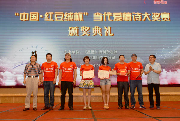 為了進一步繁榮愛情詩創(chuàng)作,弘揚正確愛情觀,特別是推動中國當代愛情詩再度輝煌,2014年7月1日,由《星星》詩刊雜志社與紅豆集團聯(lián)合啟動了“中國?紅豆絨杯”當代愛情詩大獎賽征文活動,作為紅豆七夕節(jié)的一項重要活動?,F(xiàn)在經(jīng)過一年的征集及后期評選,在今年七夕——中國情人節(jié)前夕頒獎。