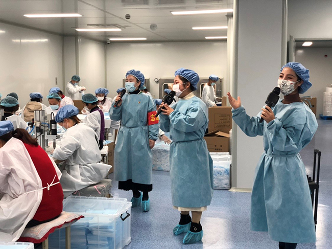 新編(工友版)男女二重唱《為了誰》,是紅豆藝術(shù)團(tuán)團(tuán)長張波為做防護(hù)服、口罩等戰(zhàn)疫物資的一線員工特意改編之作?!澳惆褠坌娜诨p進(jìn)“戰(zhàn)衣”后背。我不知道你是誰,我卻知道你為了誰……滿腔熱血,唱出紅豆無悔……你是誰,為了誰,我的紅豆姐妹不流淚……”優(yōu)美的旋律、樸實(shí)感人的歌詞,道出了一線員工在崗位上的辛勤付出,唱出了紅豆員工團(tuán)結(jié)一致抗擊疫情的強(qiáng)大力量。