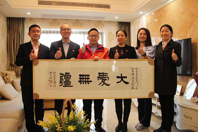 下午,紅豆集團常務(wù)副總裁、國際公司董事長戴敏君,集團品牌文化部部長錢文華率紅豆物業(yè)團隊來到殷晉偉家,上門送上最誠摯的慰問,贈予殷晉偉“大愛無疆”牌匾,代表紅豆集團全體員工向英雄表達崇高敬意!“大愛無疆”牌匾由中國書法家協(xié)會理事、無錫市國畫院院長孫璘先生親自揮毫?xí)鴮懀P鋒蒼勁有力,一筆一畫盡顯孫璘先生對“逆行英雄”的真情真意?!?/p>