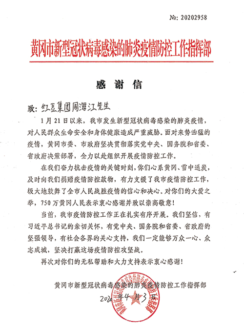 近日,湖北省“黃岡市疫情防控工作指揮部”給紅豆集團黨委書記、董事局主席兼CEO周海江發(fā)來感謝信,信中說,“在我們奮力抗擊疫情的關(guān)鍵時刻,你們心系黃岡、雪中送炭,及時向我們捐贈疫情防控款物,有力支援了我市疫情防控工作,極大地鼓舞了全市人民戰(zhàn)勝疫情的信心和決心。對你們的大愛之舉,750萬黃岡人民表示衷心感謝并致以崇高敬意!”