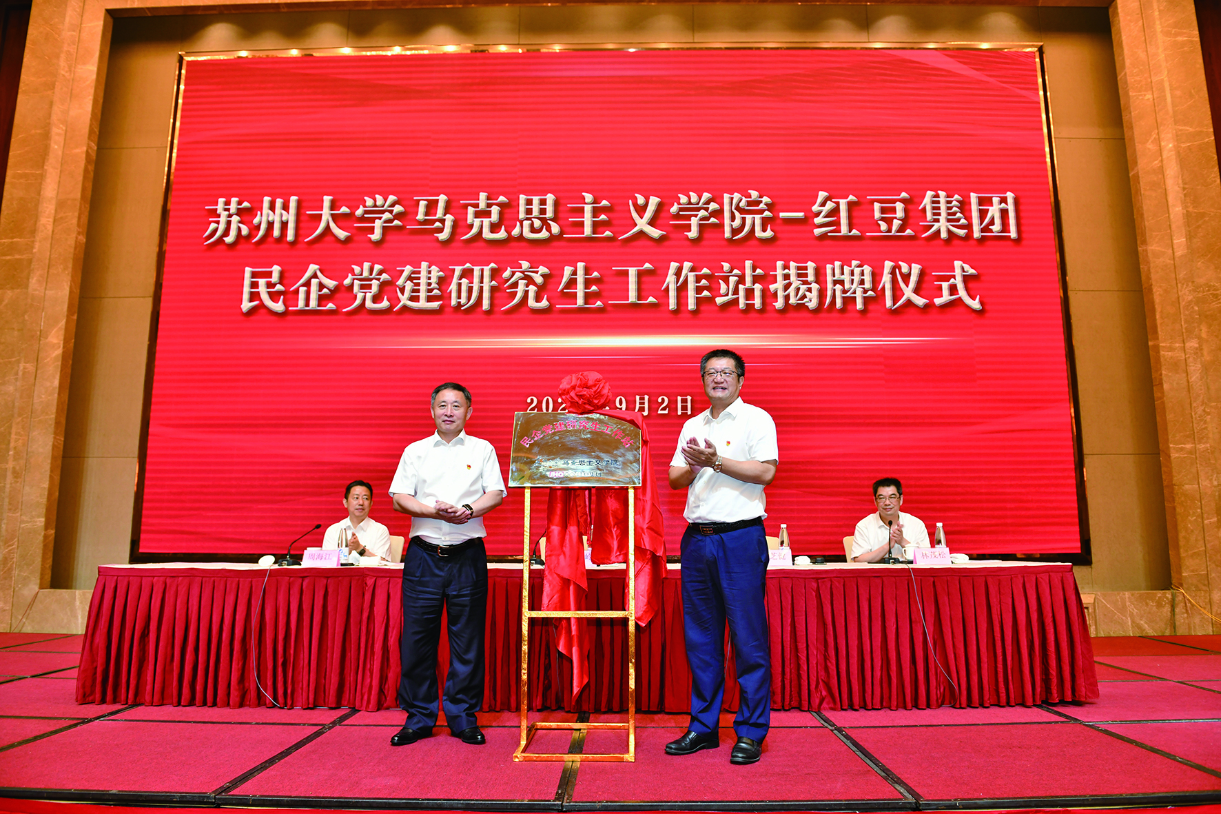 9月2日,無(wú)錫市“兩新”組織黨組織書(shū)記示范培訓(xùn)班在紅豆集團(tuán)開(kāi)班。開(kāi)班式上,蘇州大學(xué)馬克思主義學(xué)院—紅豆集團(tuán)民企黨建研究生工作站揭牌成立,無(wú)錫市委常委、組織部部長(zhǎng)柏長(zhǎng)嶺和蘇州大學(xué)馬克思主義學(xué)院院長(zhǎng)田芝健共同揭牌。